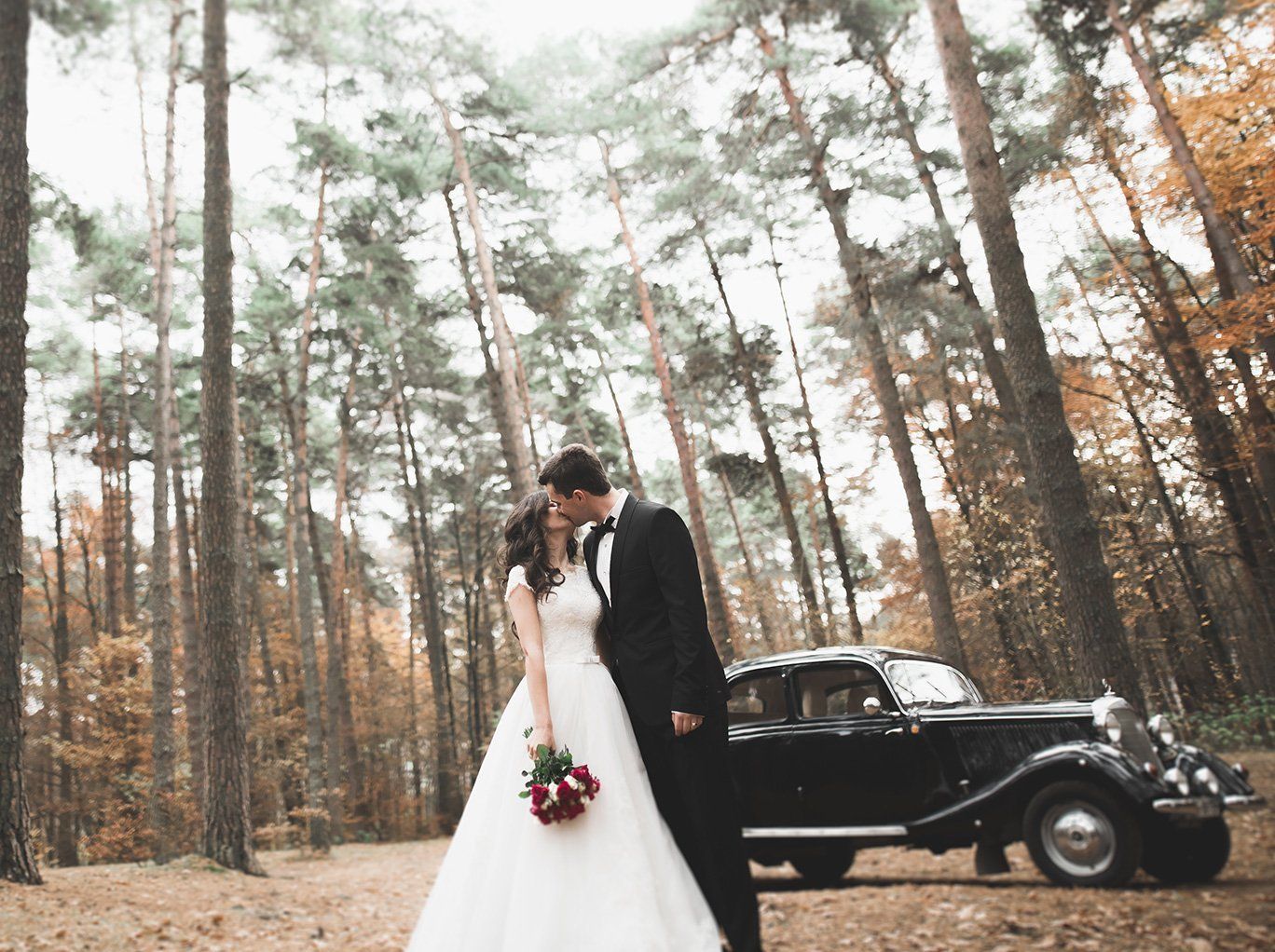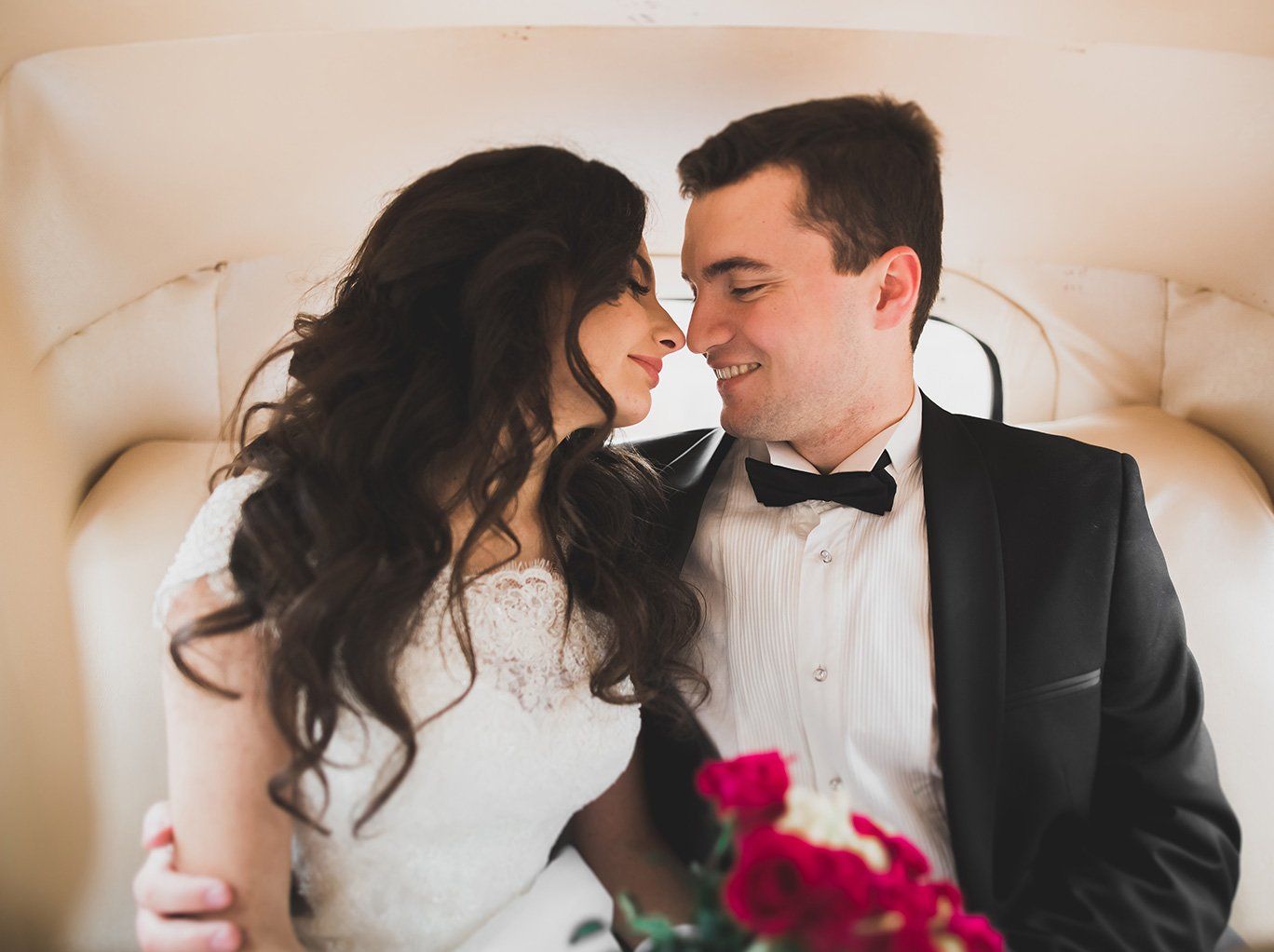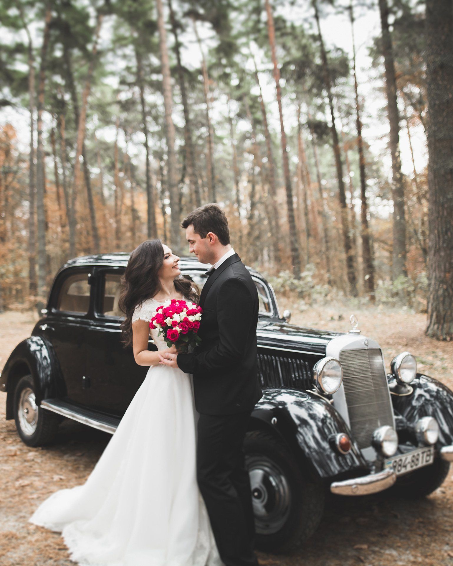 While their guests were enjoying champagne and canapes, we stole the couple away for some outdoor shots that showed off Lesley’s exquisite lace dress - and the vintage auto - to stunning effect.